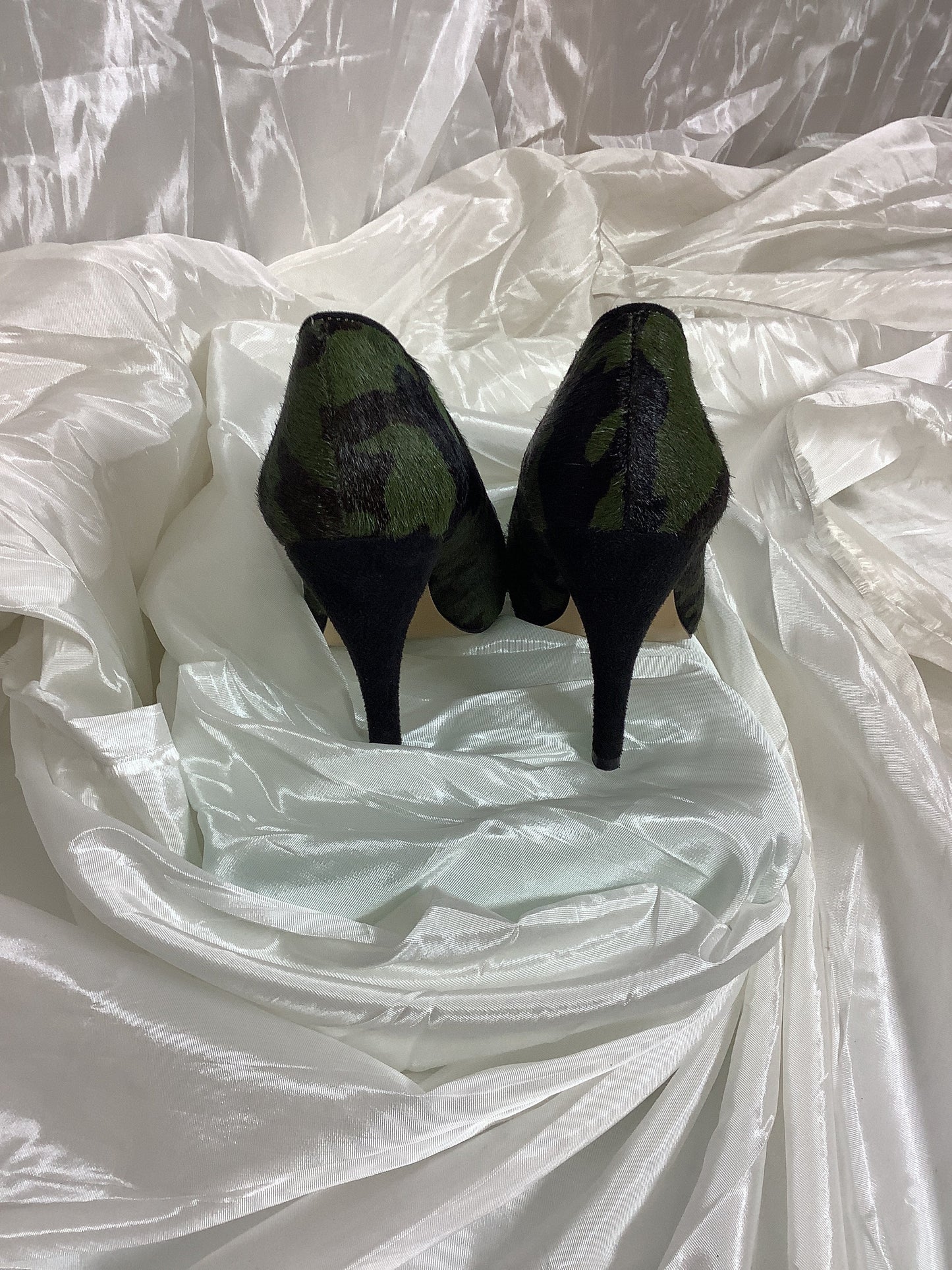 Description : Nine West high heeled shoes Size 6.5 green camo colored with a 4” heel