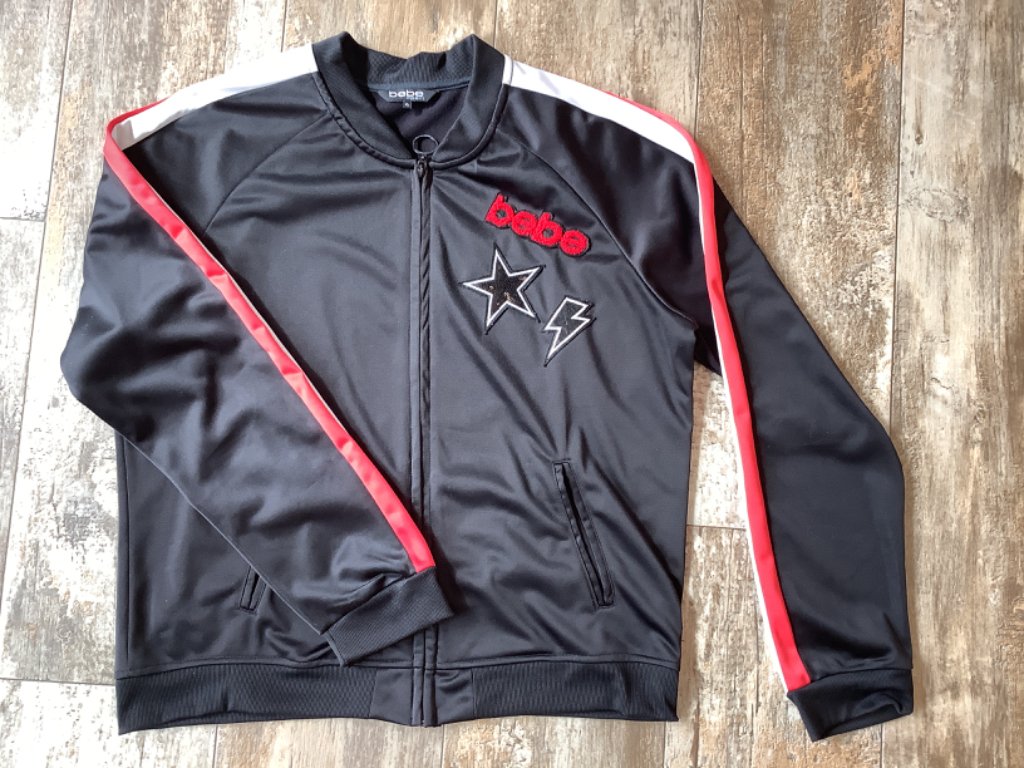 Description : Bebe Sports warm up style Jacket Beb logo, sequin star & lightning bolt on left front panel Red/white down sleeves Front pockets Size XLarge 100% Polyester