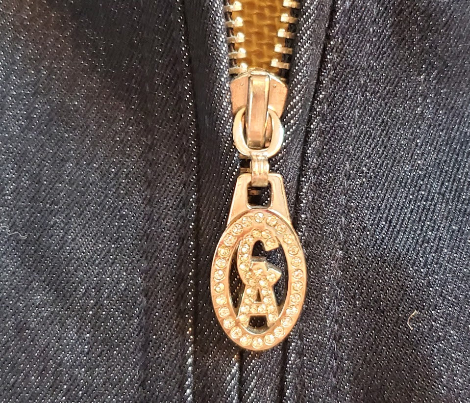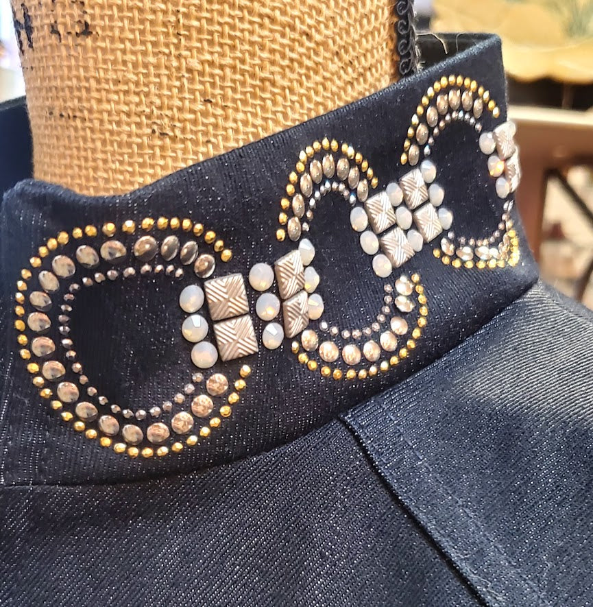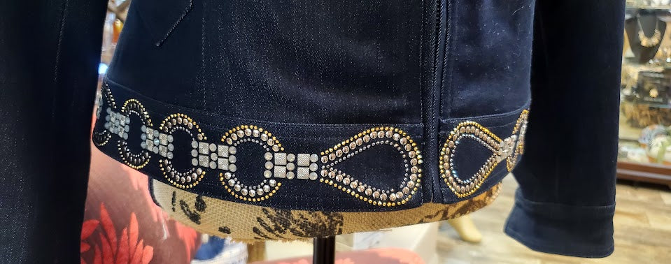 Make a bold statement with this Christine Alexander Denim Zip Front Jacket in size Medium. Featuring eye-catching bling accents, this jacket fuses classic denim edge with daring sparkle. Perfect for elevating any outfit, its zip-front design offers both style and versatility, making it a standout piece for those who love to shine with confidence.