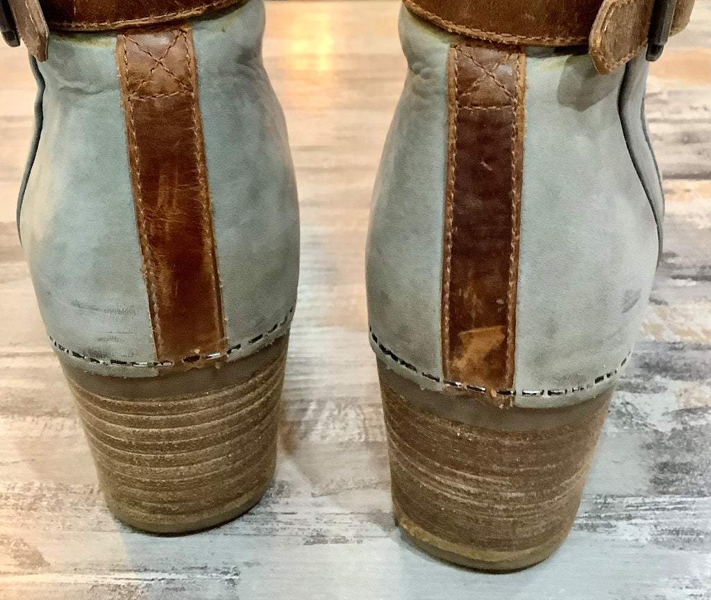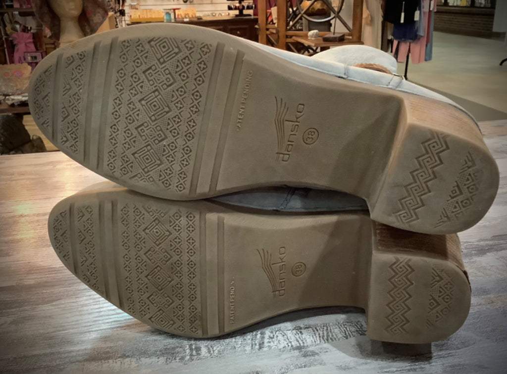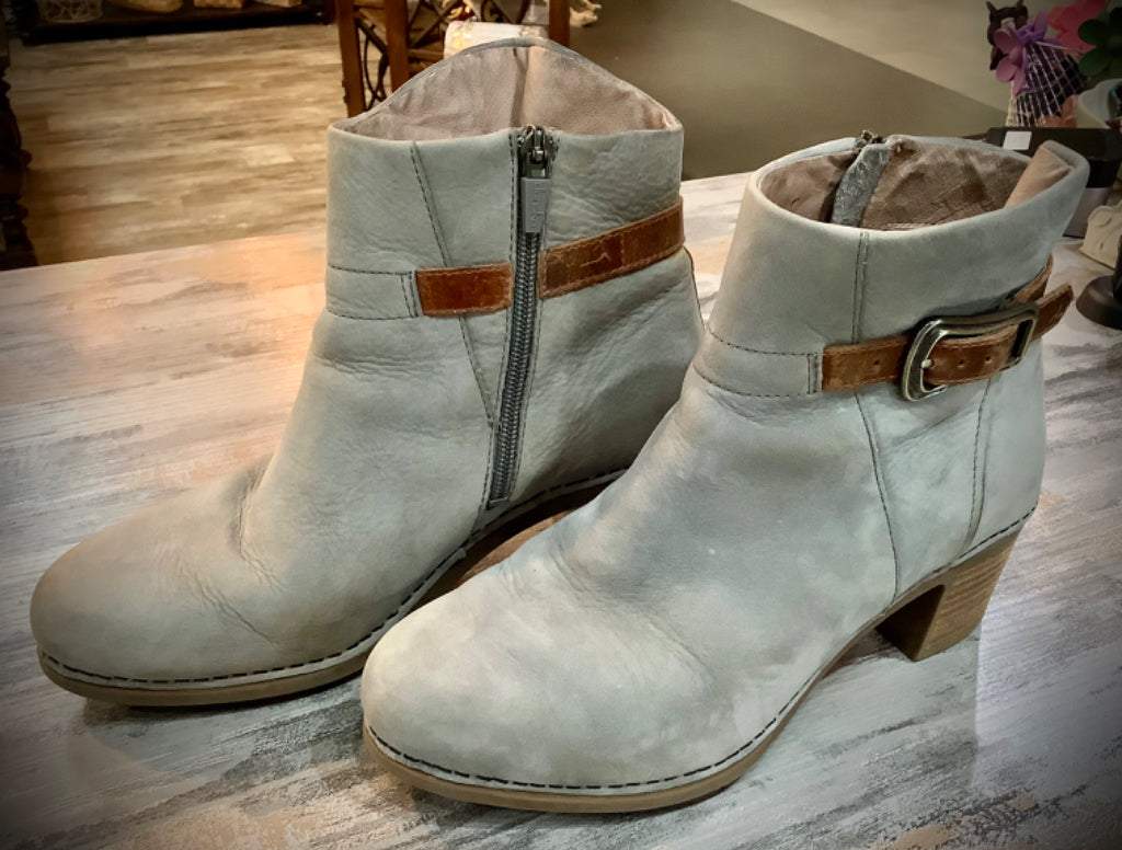 Description : Dansko Leather Ankle Boot Sz 38 Dansko 9211947814 Lt Grey Nubuck Adjustable ankle buckle Zipper Wood block 2” Heel