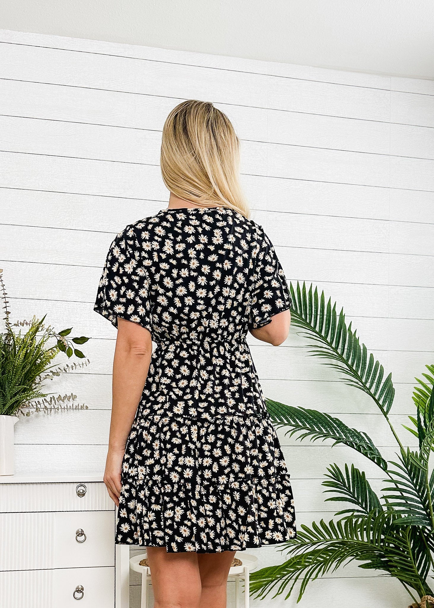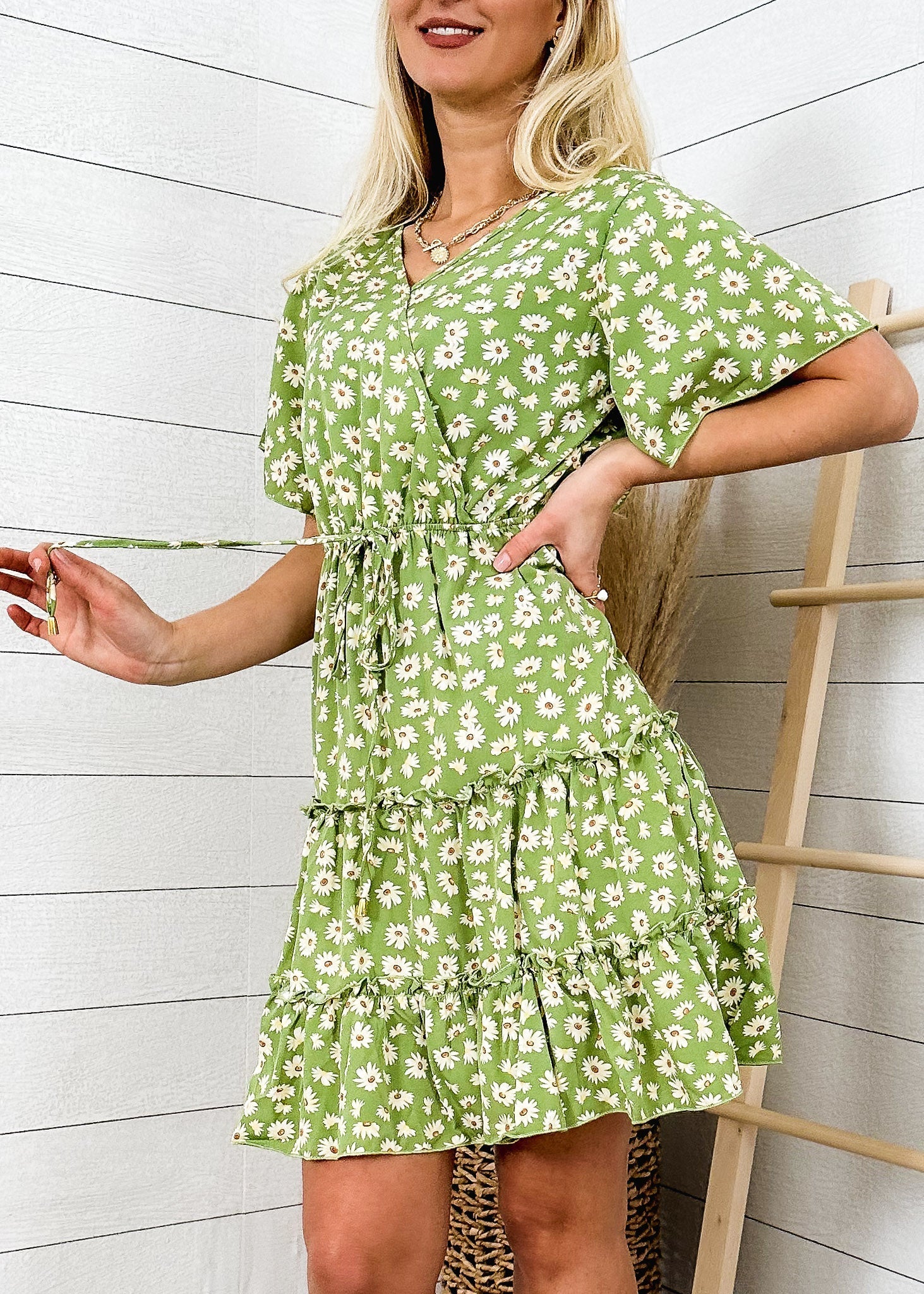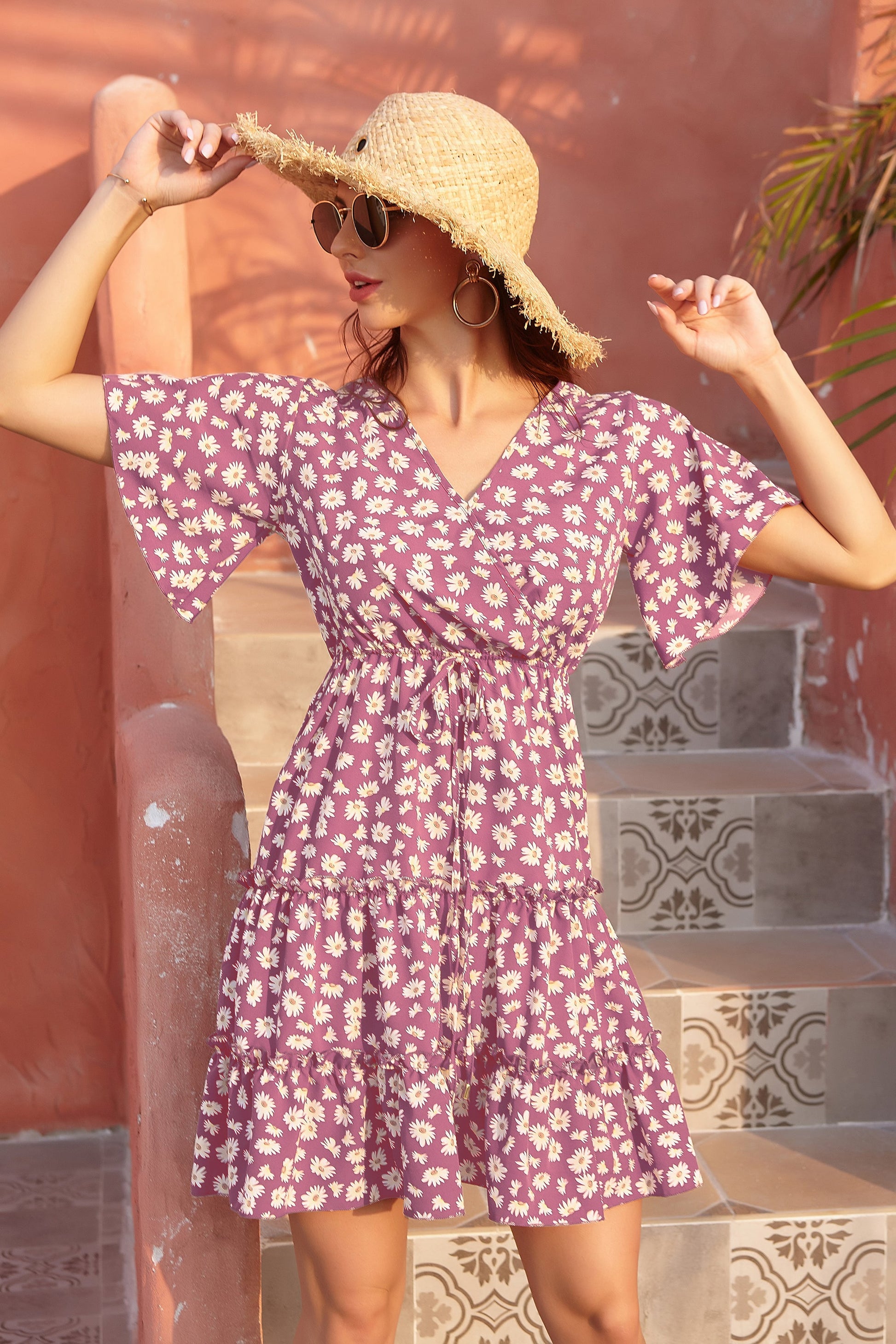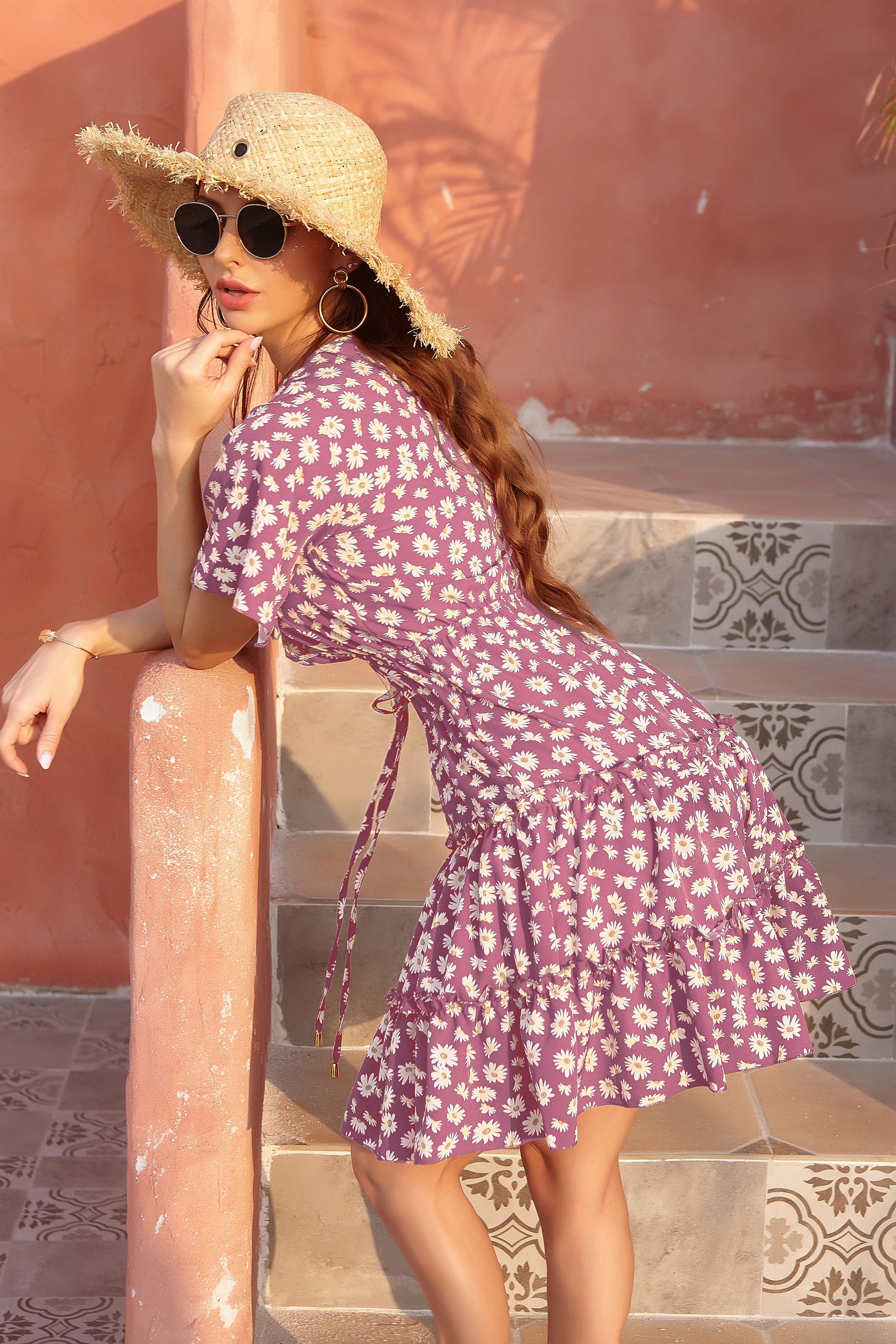 The Anna-Kaci dress is detailed with a beautiful floral print all over the dress. Features a surplice neck line, short flowy sleeves, tie waist detail, ruffle tiered skirt, and an above knee length. Pair it with strappy sandals and hoop earrings for a fun look.