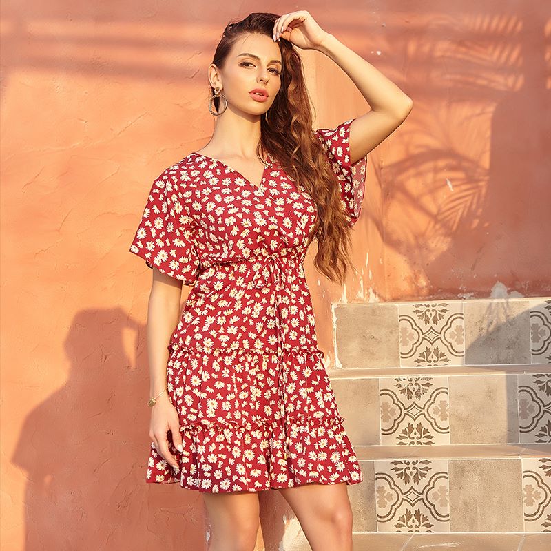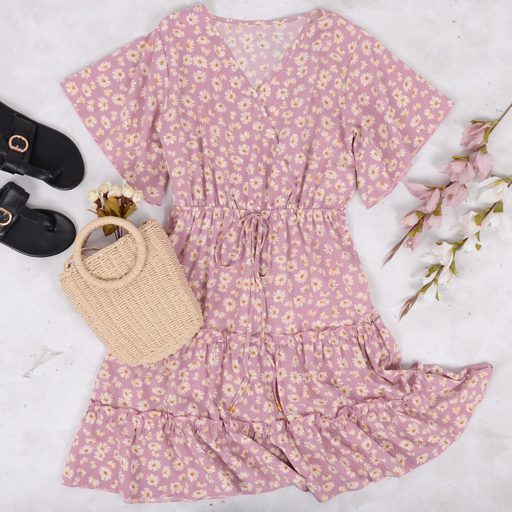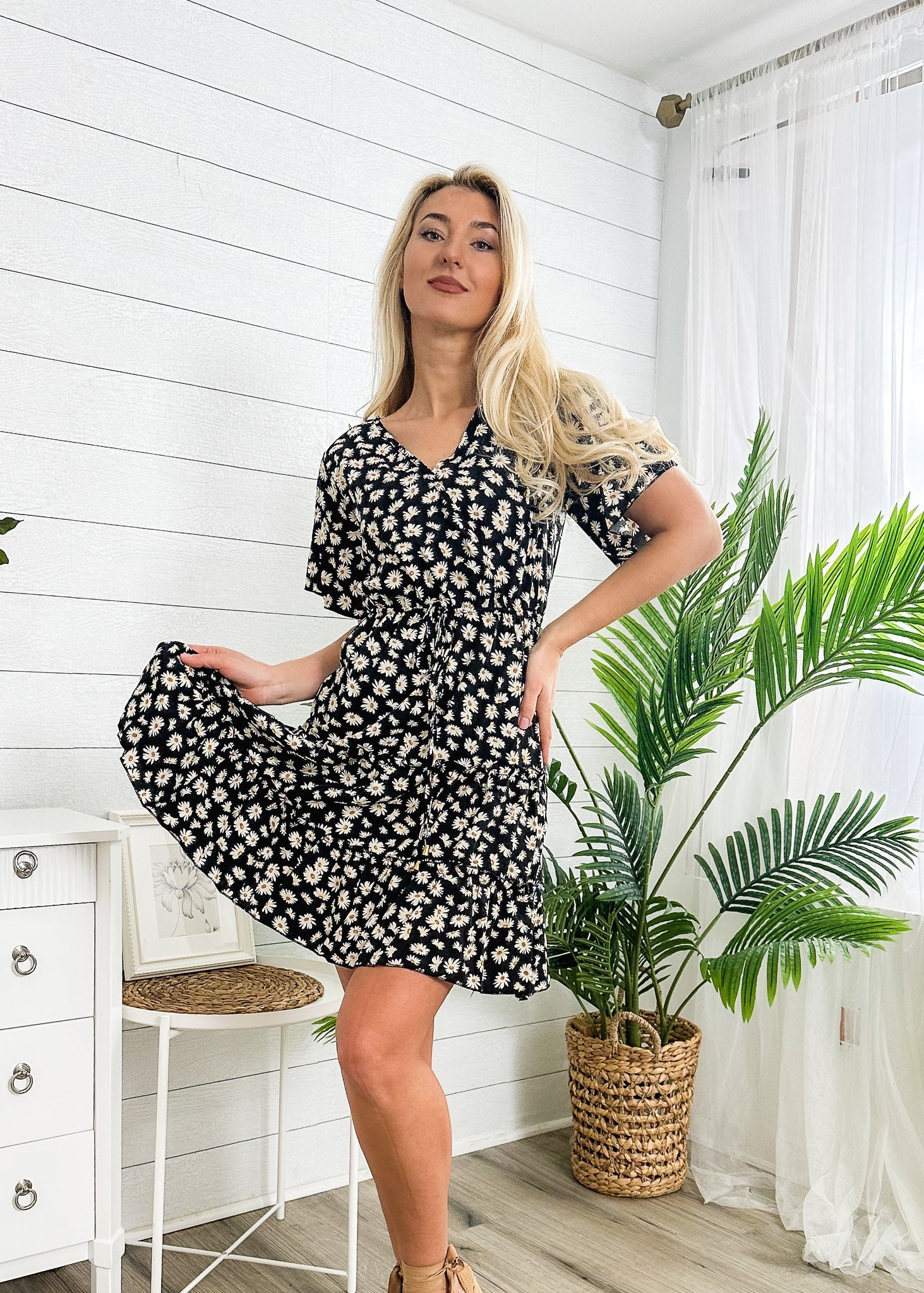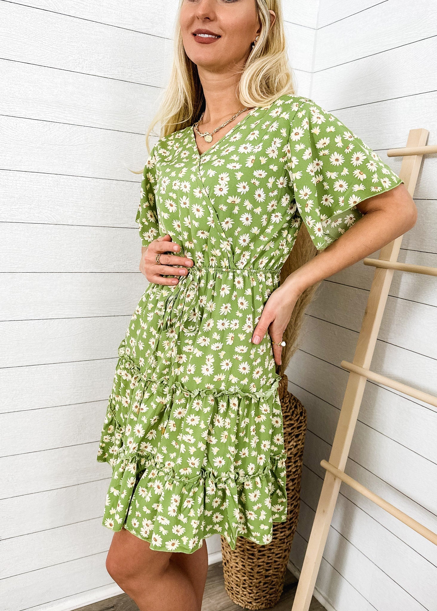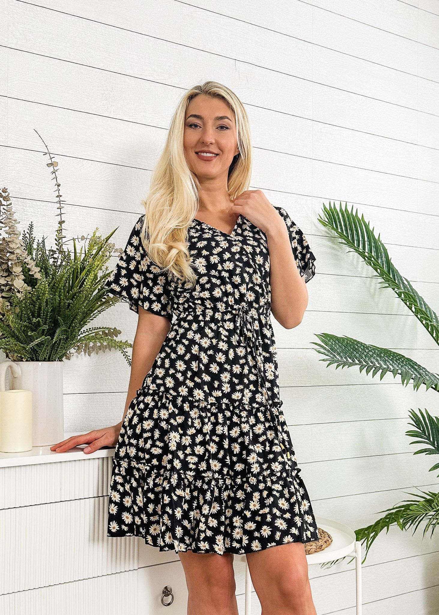 The Anna-Kaci dress is detailed with a beautiful floral print all over the dress. Features a surplice neck line, short flowy sleeves, tie waist detail, ruffle tiered skirt, and an above knee length. Pair it with strappy sandals and hoop earrings for a fun look.