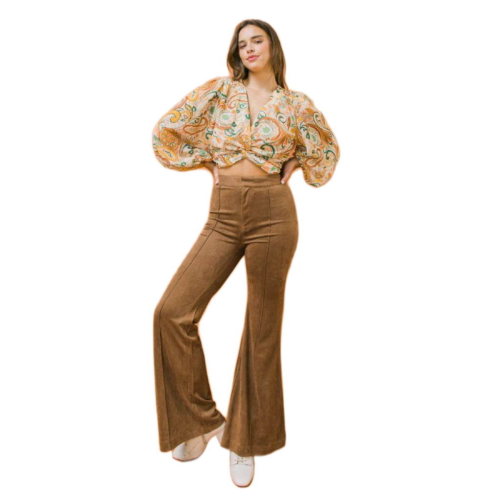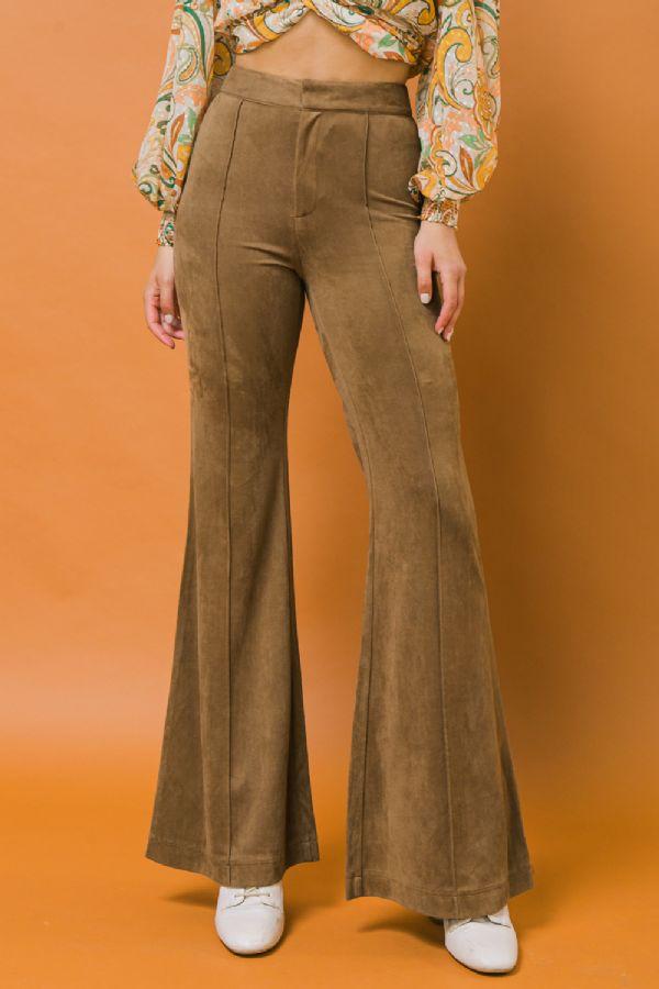 Description : Flying Tomato Faux Suede Pant Color: camel HIgh Waisted Flared Bottom