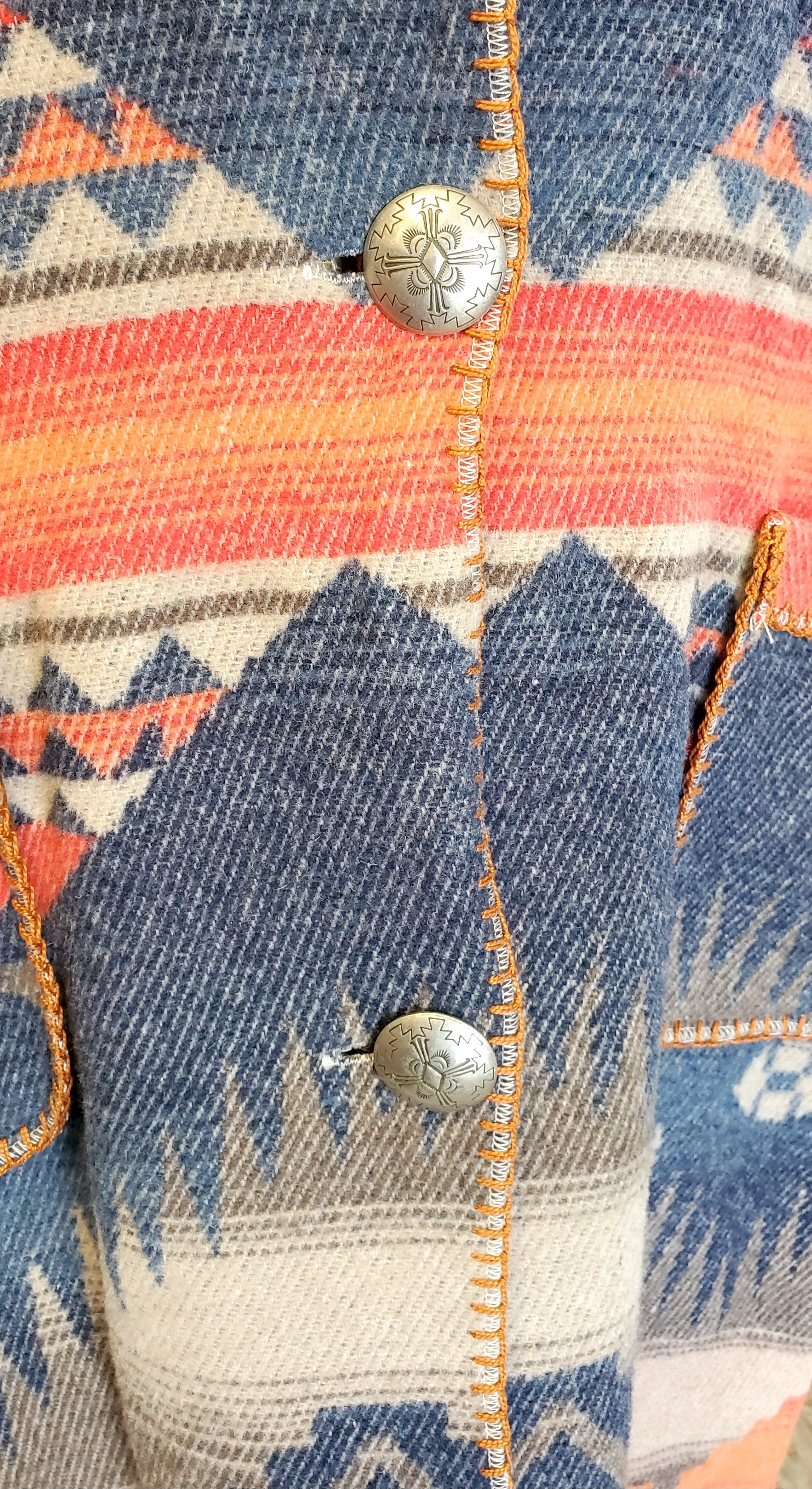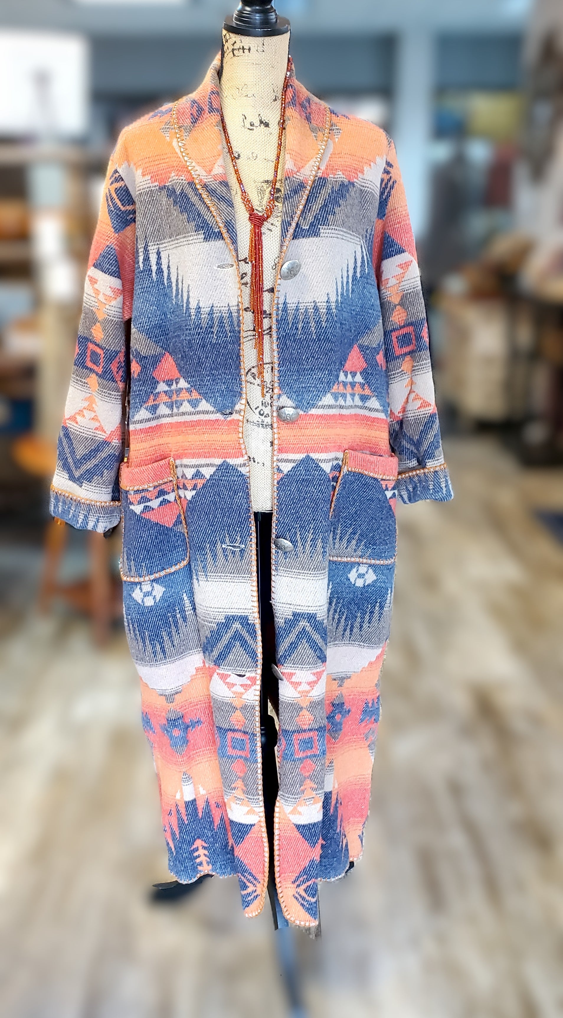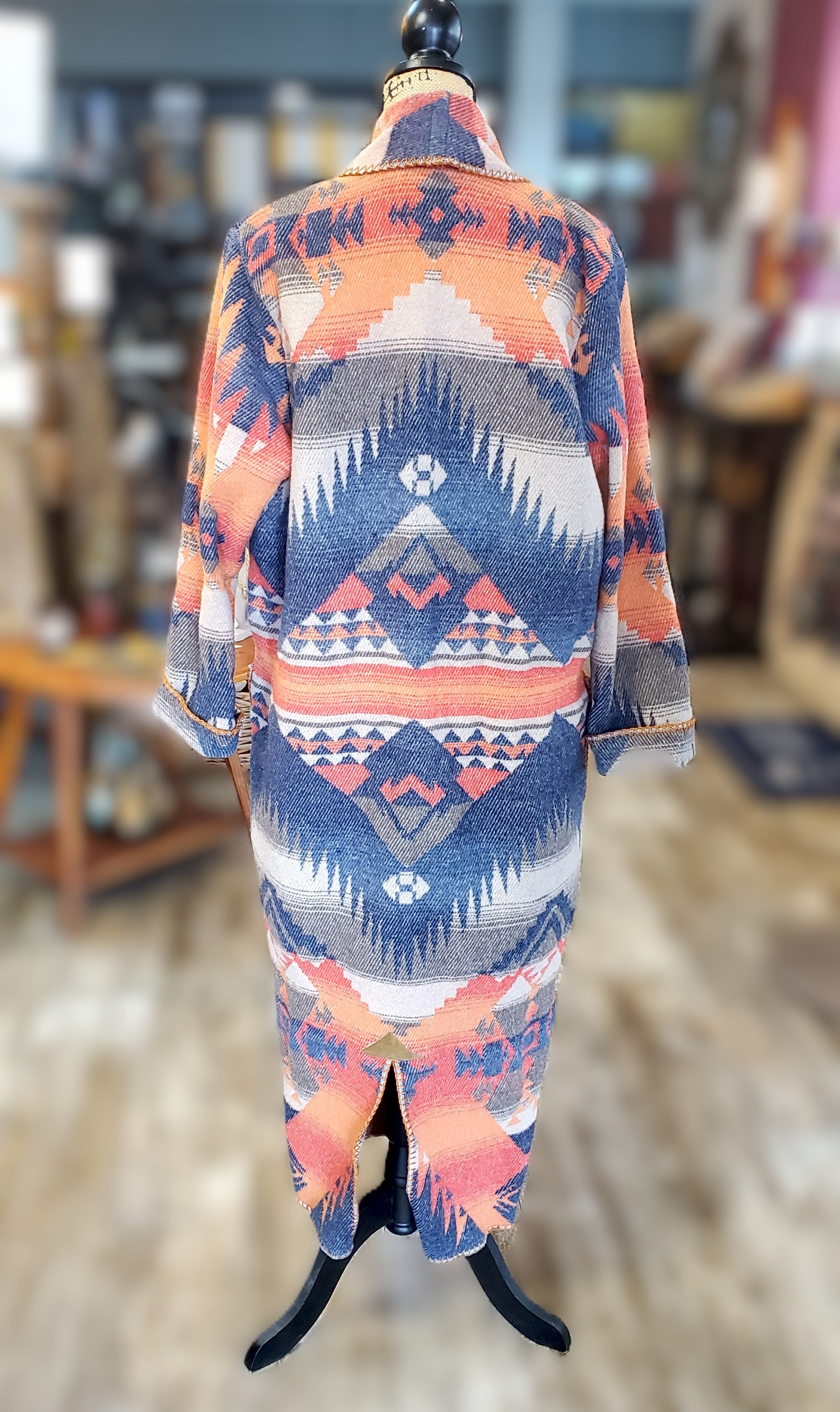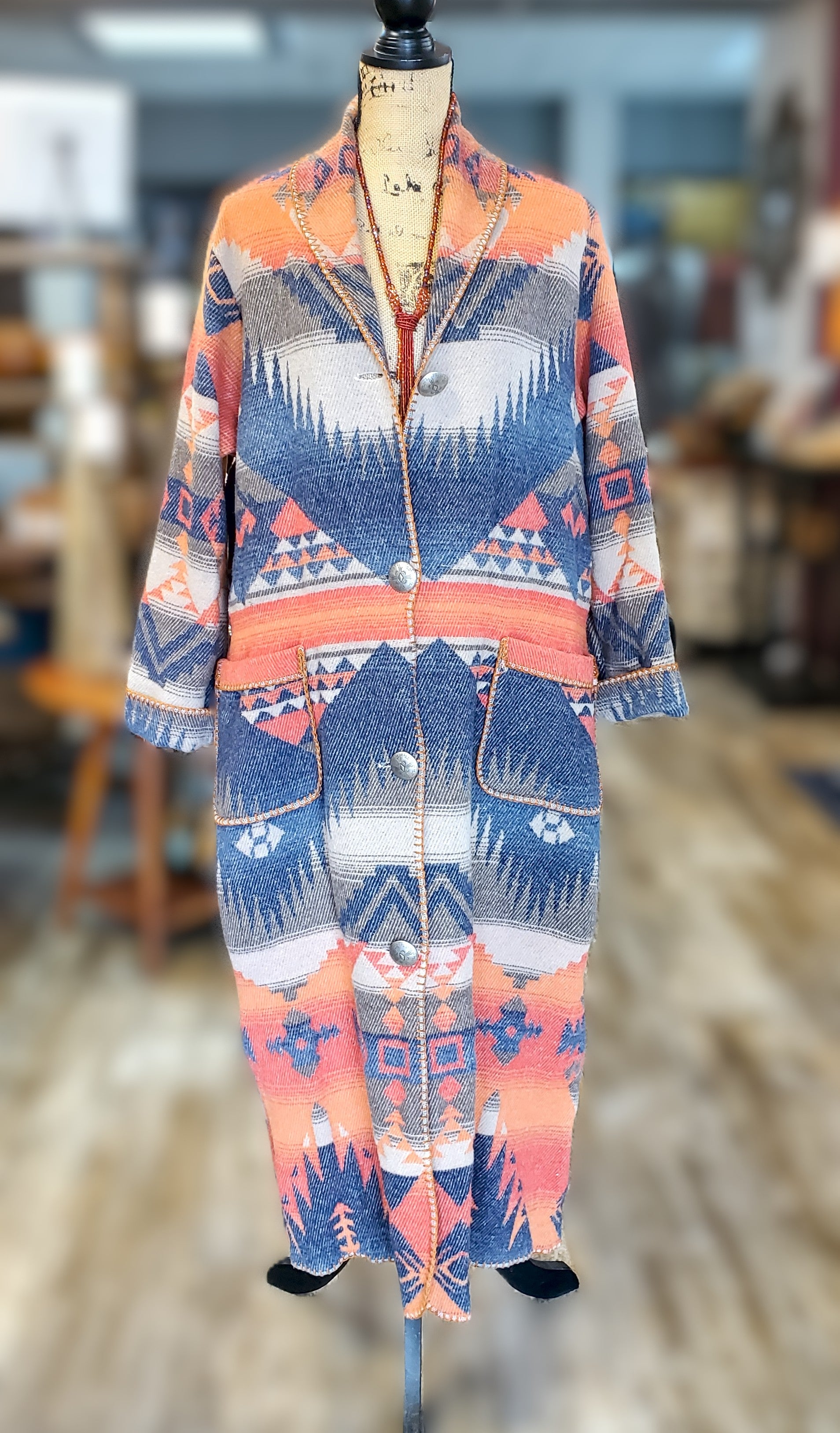 Stay warm and stand out with the Rhonda Stark Western Wool Duster Coat. Crafted from a cozy wool blend, this long coat features a striking Indigenous-inspired pattern that adds bold style to any look. Its western cut brings timeless edge, perfect for those who want to make a confident statement while embracing classic warmth. Ideal for layering, this size small duster combines functionality with fearless fashion.