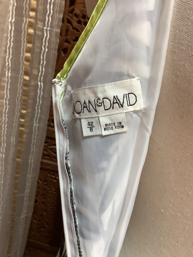 Description : Joan & David A-Line Sleeveless Dress Dress Sz 8/42 Black & White Tropical print on cotton with Full lining. Chartreuse piping along neckline and hemline Zipper Back Gathered fabric waistline