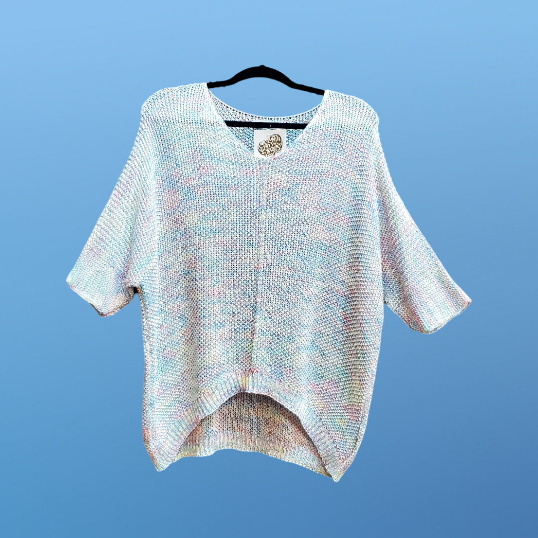 This playful and quirky Karamel Collection Sprinkle Sweater SZ OSFM will add a pop of color to any outfit! With its multi-colored knit design and short sleeves, it's the perfect combination of style and comfort. Get ready to sprinkle some fun into your wardrobe with this must-have sweater!