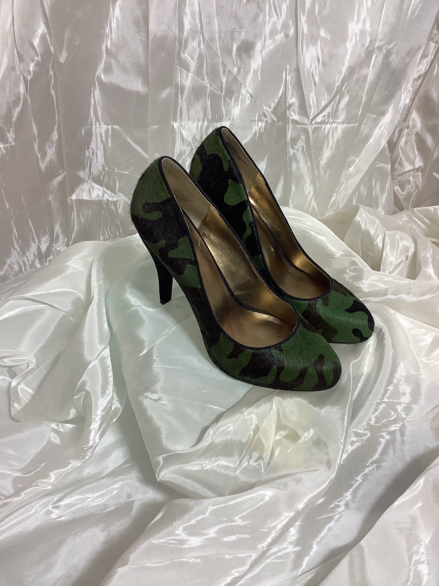Description : Nine West high heeled shoes Size 6.5 green camo colored with a 4” heel