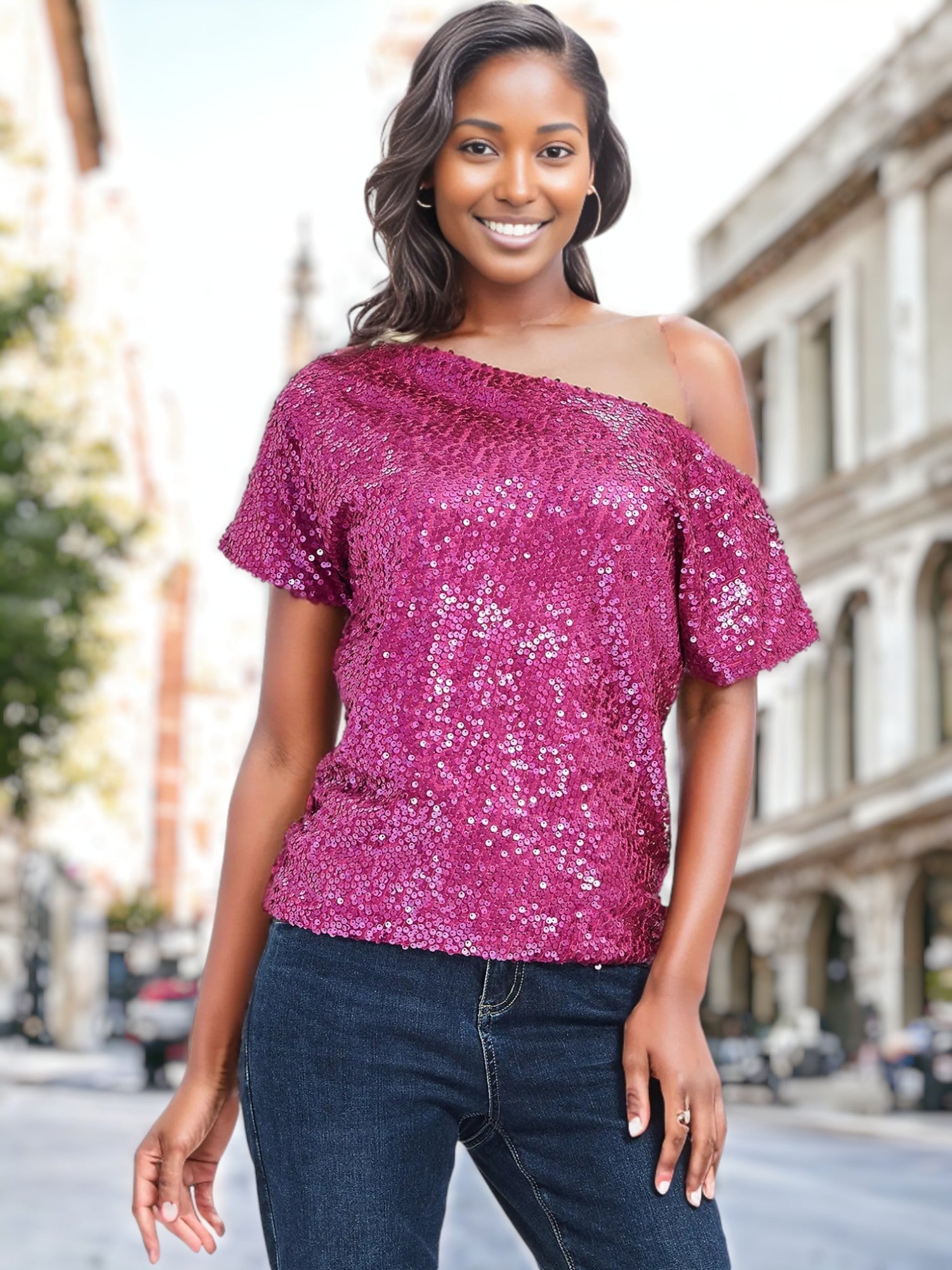 One Shoulder Cap Sleeve Sequin Top by Anna-Kaci