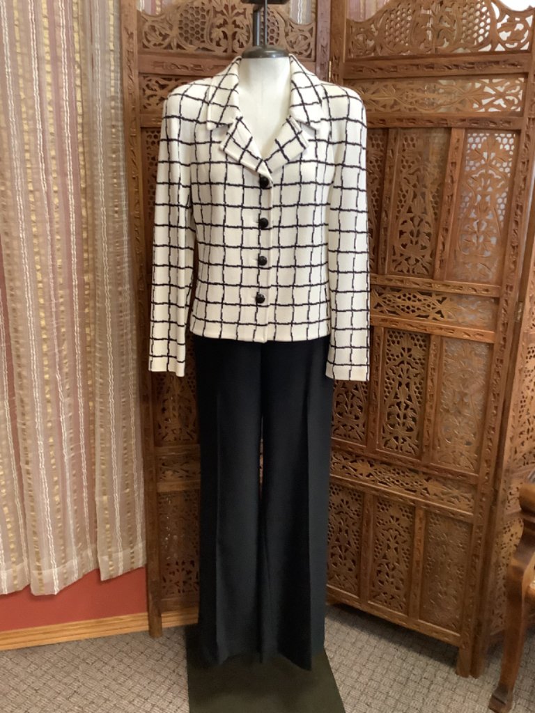 Description : St. John Collection 2pc Knit Blazer and Slacks Size 6 Blazer is a double knit wool/polyester with a block square pattern. Slacks are a solid black wool polyester blend. Slacks have pockets. Wide straight leg slacks.