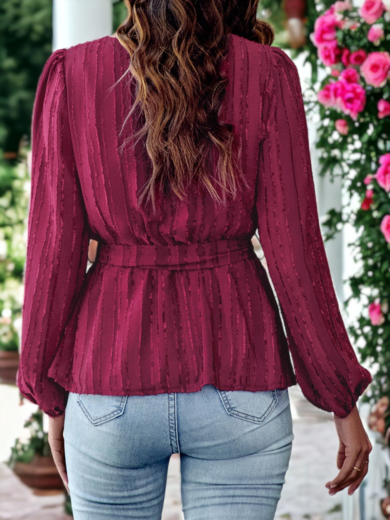 V Neck Textured Peplum Hem Long Sleeve Blouse by Anna-Kaci